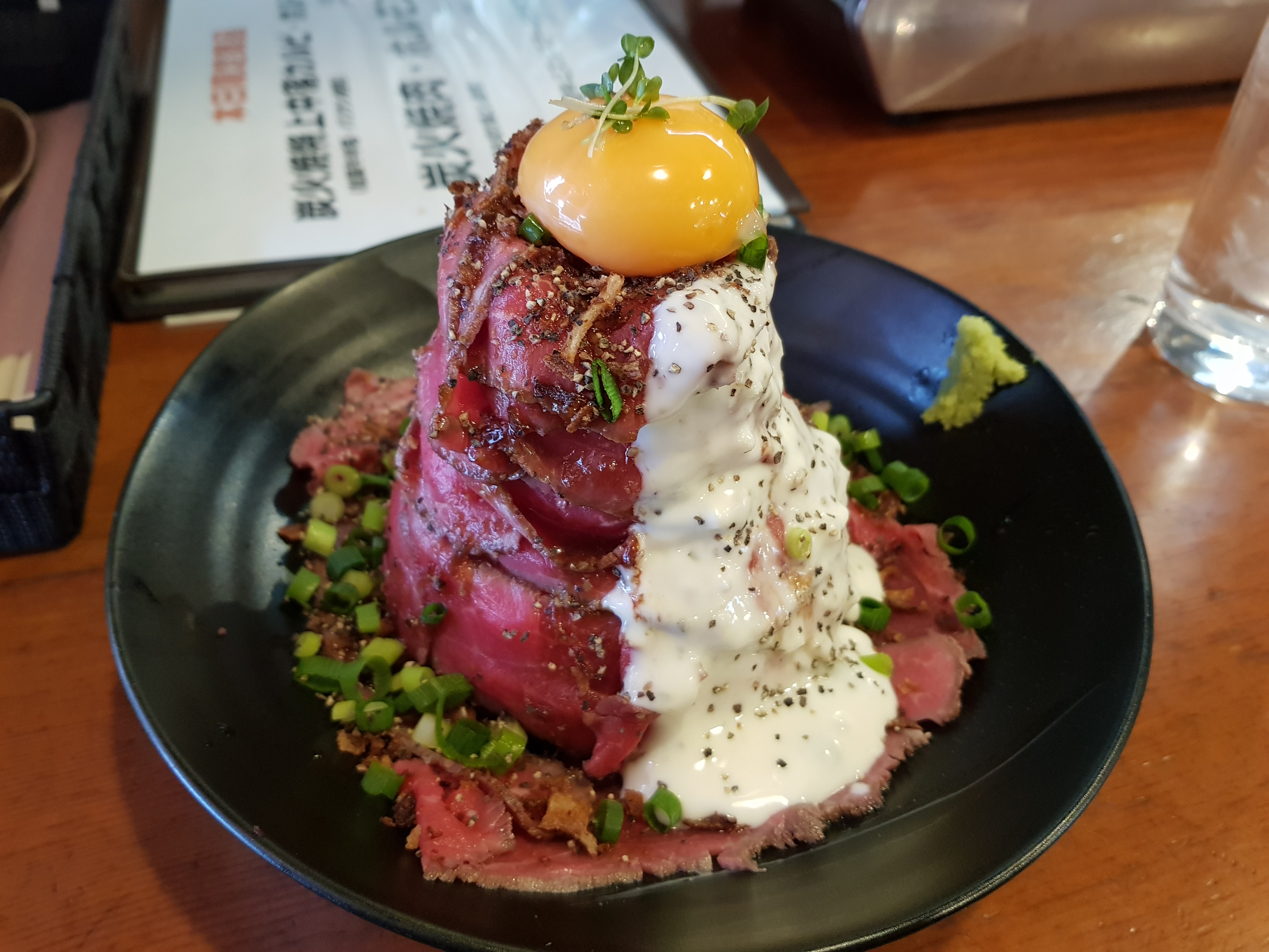 비주얼이 꽤나 폭력적인 덮밥인데 밥을 탑처럼 쌓고 종이처럼 얇게 썰은 고기를 감아서 나온다. 소스는 마가 들어간건지 꽤 쌉쌀한 맛이 있고 고소하다.